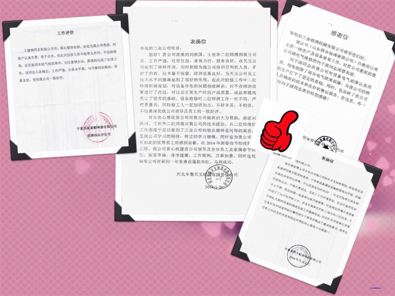 近日,辛集天玉(yù)、吐魯番毓牛、寧夏西(xī)夏、山東聯合(hé)等客戶單位紛(fēn)紛發來感謝信和表揚信,對草莓视频网站公司劉繼國、王(wáng)世華、劉子源(yuán)、孫(sūn)俊、王建鋼等售(shòu)後服務人員的精湛技術、良好的售後服務(wù)和認真負責的敬業精神表(biǎo)示(shì)讚揚肯定,這是對草莓视频网站品牌和服務的認可。客戶的(de)肯定(dìng)是草莓视频网站前進的最大動力,“精益求精打造草莓视频网站品牌,全心全意服務用戶”將是我們不竭的追(zhuī)求。